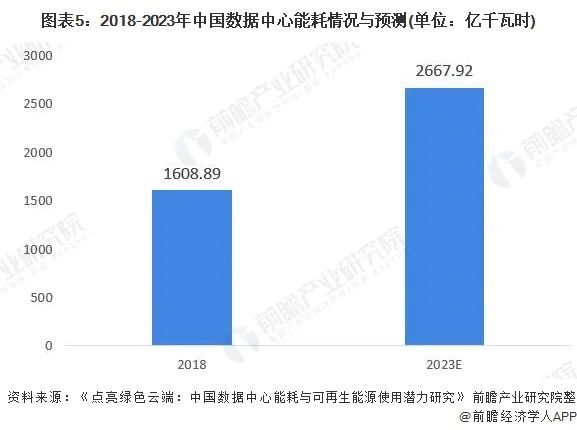 据国际环保组织绿色和平与华北电力大学最新发布的《点亮绿色云端:中国数据中心能耗与可再生能源使用潜力研究》数据显示,2018年,我国数据中心用电总量已经超过了上海全社会用电总量(1566.7亿千瓦),为1608.89亿千瓦时,占中国全社会用电量的2.35%,占第三产业用电量的14.9%;2023年中国数据中心总用电量将达到2667.92亿千瓦时,年复合增长率达到10.64%。