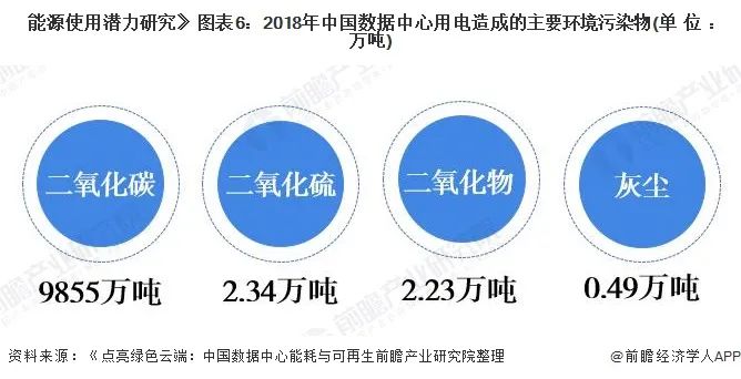 除了耗电量高之外,数据中心使用的大比例化石能源所带来的空气污染与碳排放问题也尤为突出。2018年,全中国数据中心使用火电约为1171.81亿千瓦时,排放了9855万吨的二氧化碳、2.34万吨的二氧化硫、2.23万吨的二氧化物和0.49万吨的烟尘。