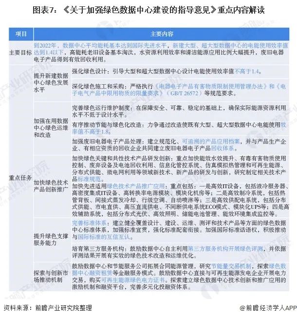 因此,国家近年来也出台相应的政策积极引导全国数据中心往绿色化、节能化方向发展。在最新发布的《关于加强绿色数据中心建设的指导意见》中提出了我国对建设数据中心能源消耗的规划,提出到2022年,数据中心平均能耗基本达到国际先进水平,新建大型、超大型数据中心的电能使用效率值达到1.4以下,高能耗老旧设备基本淘汰,水资源利用效率和清洁能源应用比例大幅提升,废旧电器电子产品得到有效回收利用。