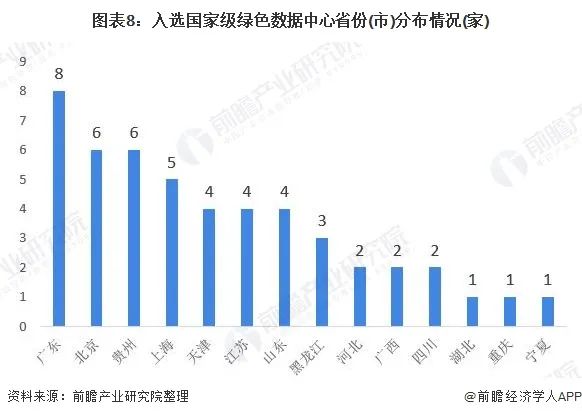 另一方面,国家为鼓励绿色数据中心的建设,早在2015年10月就对全国进行了一次国家绿色数据中心精选工作,北京、上海、广东、天津、河北、江苏等14个地区入选第一批遴选地址,并且在生产制造、电信、公共机构、互联网、金融、能源6个重点领域中评选出了49家数据中心纳入到《国家绿色数据中心名单》。广东省入选的数据中心数量最多,达到8家;其次是北京和贵州,均为6家。上海入选的数据中心5家。