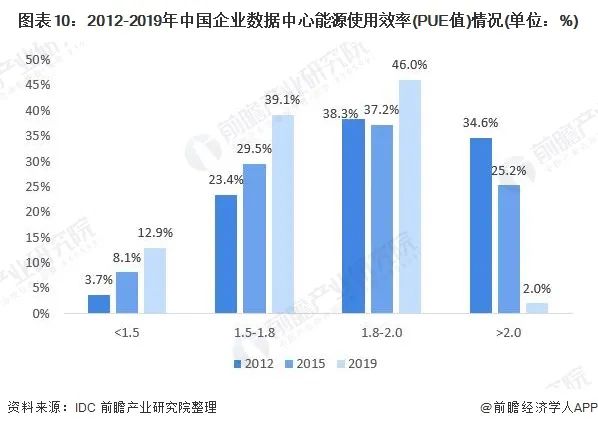 在国家的正确引导下,我国数据中心能源的使用率有了明显的改善。2012年,PUE值在1.5以下的企业数据中心占比仅为3.7%,PUE值大于2的企业数据中心占比达到了34.6%。2019年,PUE值在1.5以下的企业数据中心占比提升至了12.9%,PUE值大于2的企业数据中心占比下降至2%。