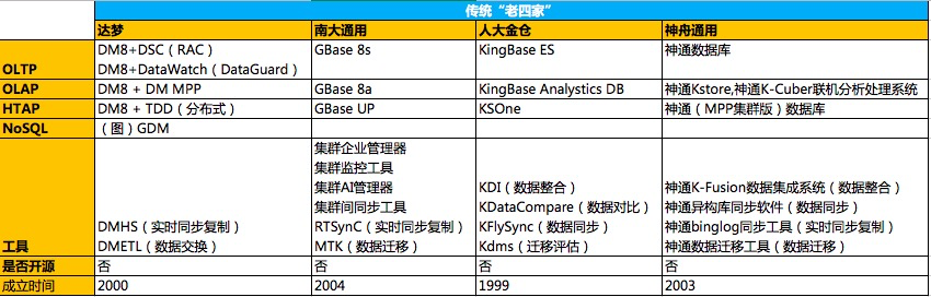 从产品布局看,老四家特点很显著,专注关系型数据库市场,在非关系数据库领域基本没有什么产品布局,只有达梦有个图数据库。