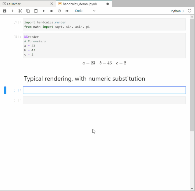 如下图,先设好3个参数a、b、c的值,然后用Python列出表达式,在最前面放个%%render。