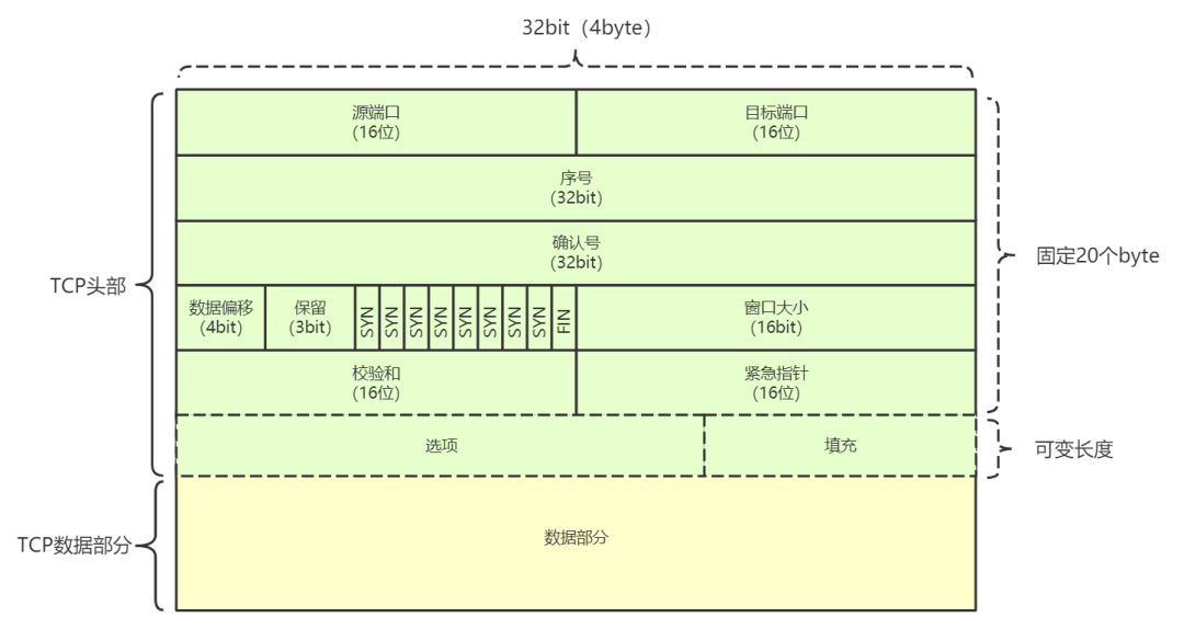 TCP 报文包含数据头和数据体,头部有 5 行的固定长度以及 1 行可变长度!图上前面 5 行就是固定长度!