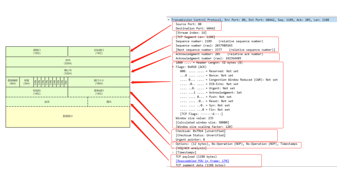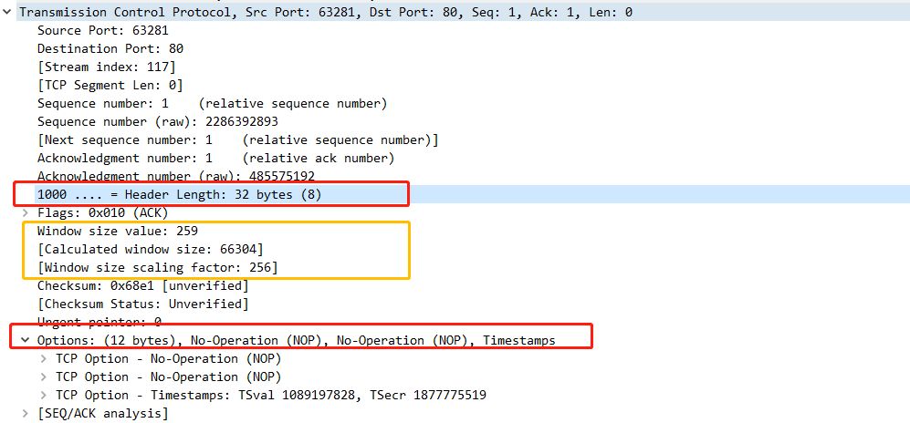 红色部分显示了 TCP 头部的长度为 32byte,以及选项部分为 12byte。前面我们说了 TCP 首部固定长度为 20byte,所以 20+12=32。