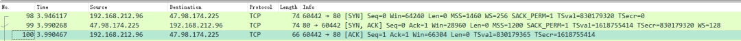 当我鼠标选择某一行时,如果这个数据包包含了对某个数据包的确认(也就是有 ACK 的标记),就能在对应的数据包的 No 列上面看到一个小勾勾,比如上面图中我鼠标选择的是第三次握手的数据包,在第二次握手的数据包前面就有个小勾勾。
