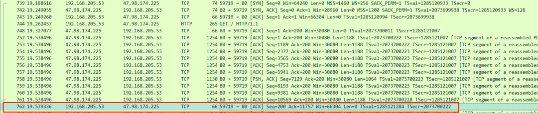 这里我们能看到服务器发送多个数据包后,客户端才进行了一次确认。