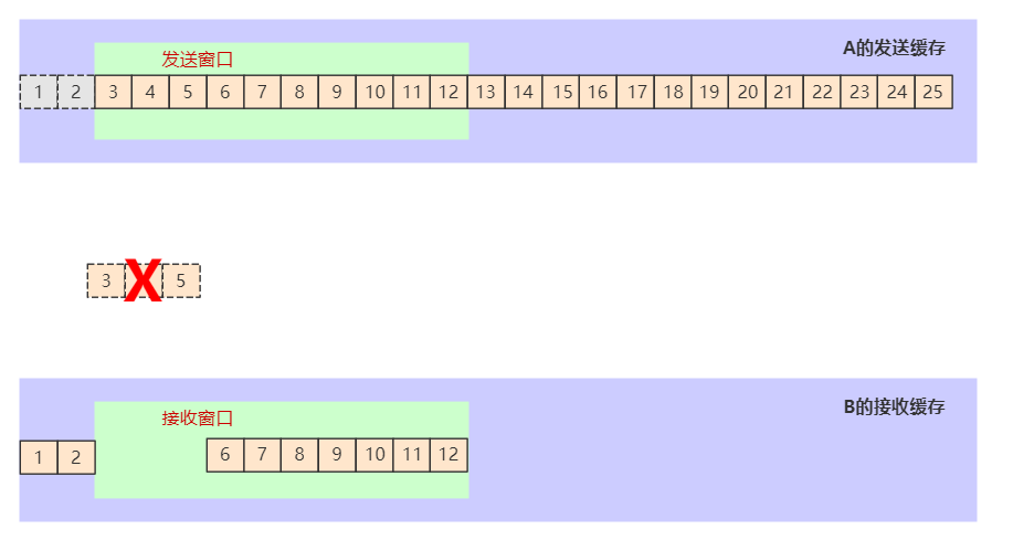 如果是这种情况,A 的发送窗口是不会移动的。B 在接收到后面数据包的时候回复给 A 的 ACK 会设置为 3,且在选项中设置一个 SACK(在 TCP 头部选项里面有描述),告诉 A 哪部分数据收到了,而哪部分数据需要进行重发!