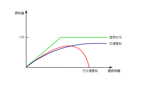 绿线代表理想状况下,如果高速公路的吞吐量为 100!当需要通过的车辆不超过 100 时,所有车辆都能顺利通过!当需要通过的车辆超过 100,那每次通行的车辆为 100,能提供的负载比较稳定。