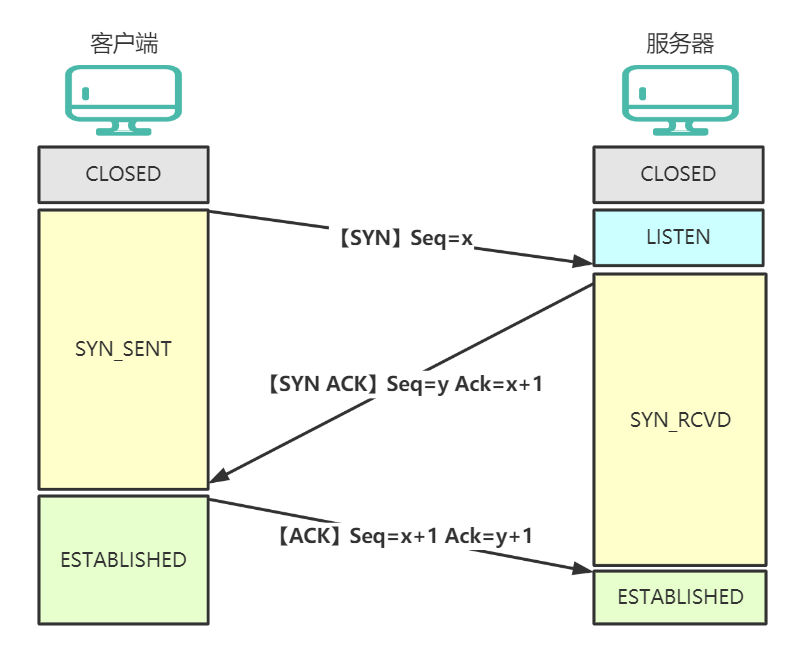 B 主机收到连接请求后向 A 主机发送标识 SYN=1,ACK=1(SYN 表示 B 请求跟 A 建立连接,ACK 表示对 A 的连接请求进行应答),序号 Seq=y,确认号 Ack=(x+1),A 接收到 B 的确认后,状态变为 ESTABLISHED,B 的状态依然为 SYN_RCVD!