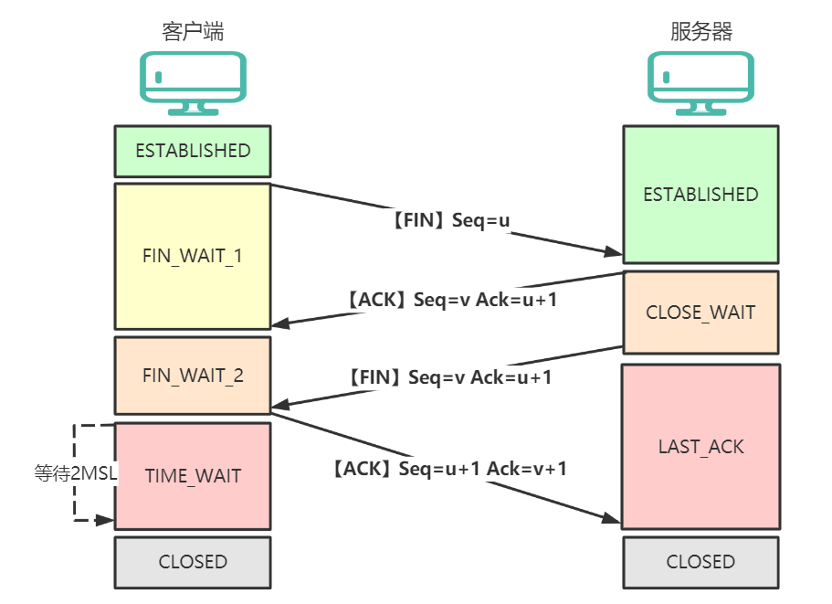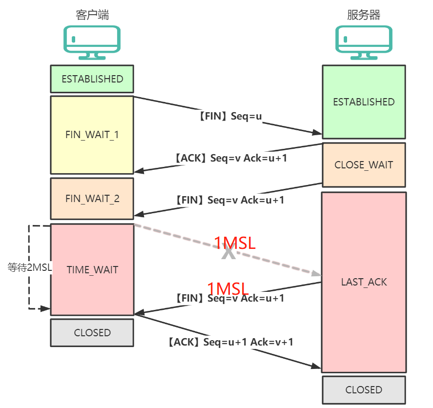 在图中我们能看到,A 的 TIME_WAIT 状态会持续 2MSL 再变成 CLOSED。