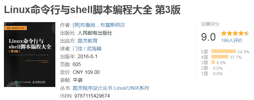 这本书是入门级的读物,是关于Linux命令行与shell脚本编程的全方位教程,主要包括四大部分:Linux命令行,shell脚本编程基础,高级shell脚本编程,如何创建实用的shell脚本。我最近刚看完Shell编程相关的视频课程,有了一定的基础,目前在看这本书。虽然很大部头,但有一定基础之后看起来还是蛮快的。讲的东西比较全面,也比较简单。作为入门推荐4颗星。