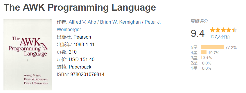 这本书的作者就是AWK程序语言的设计者,其权威性毋庸置疑。值得注意的是,这本书的第二作者 Brian W. Kernighan简直是神一样的科学家,他还是《The C Programming Language》和《程序设计实践》的作者,在豆瓣图书中搜索Brian W. Kernighan的名字,你就会五体投地。