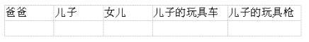 第三范式,理论概念是在第二范式的基础上,数据表中不存在非关键字段对任一候选关键字段的传递函数依赖,即除了主键外,其他字段必须依赖主键。如下例子,“爸爸”是主键,但是“儿子的玩具车”和“儿子的玩具枪”依赖的是“儿子”,并不依赖于主键,存在传递函数依赖的关系,因此不符合第三范式,