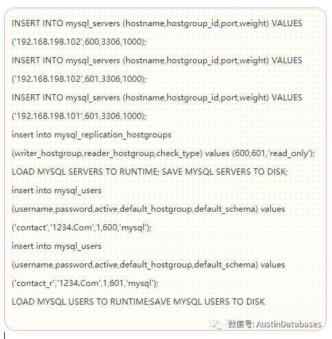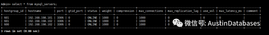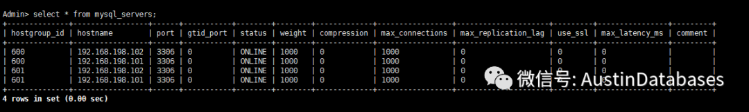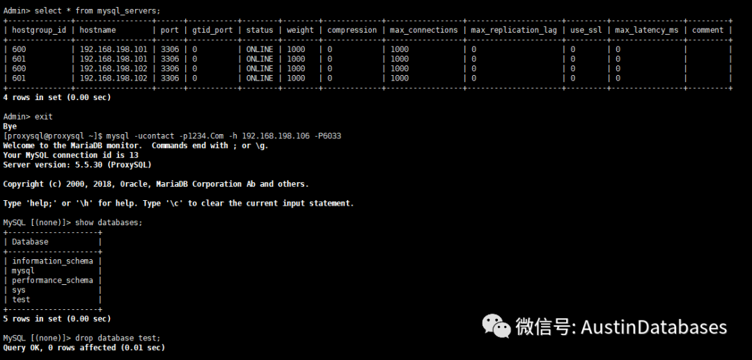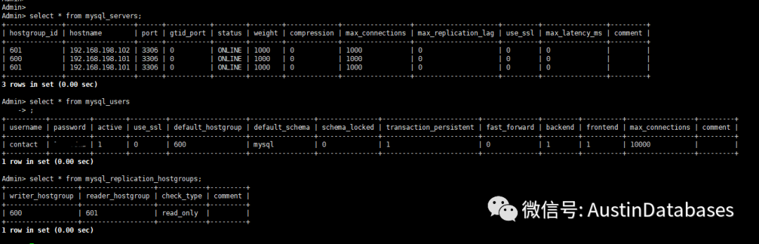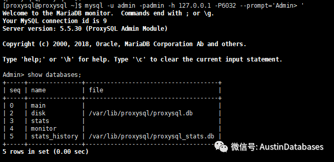 1 登陆到PROXYSQL 的管理端 mysql -u admin -padmin -h 127.0.0.1 -P6032 --prompt='Admin> '