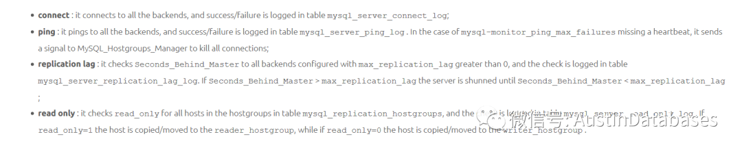 答案就在下图, proxysql 在 1- 2秒会通过查看当前服务器的read_only 来判断当前的服务器是否应该在写的组,并且在1 分钟内会对所在的宿主服务器进行一个连接性的判断。