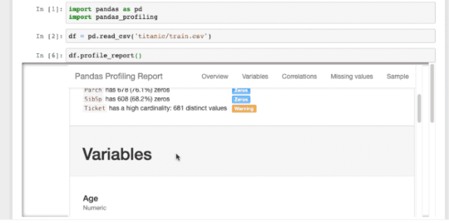 这一行代码就是在 Jupyter notebook 中显示数据分析报告所需的全部代码。报告非常详细,必要时包括图表。