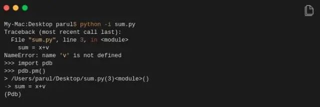 从命令行运行 python 脚本的一种典型方法是:python hello.py。但是,如果您在运行同一脚本(如 python)时添加了一个额外的-i hello.py,那么它提供了更多的优势。让我们看看怎么做。首先,只要程序不结束,python 就不会退出解释器。因此,我们可以检查变量的值以及程序中定义的函数的正确性。其次,我们可以通过以下方式轻松调用 Python 调试器,因为我们仍在解释器中:这将使我们进入异常发生的位置,然后我们可以处理代码。