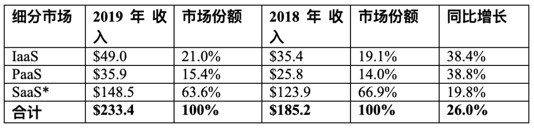 2019 年 IaaS 收入同比增长 38.4% 至 490 亿美元;PaaS 同比增长 38.8% 至 359 亿美元;SaaS 增长 19.8% 至 1485 亿美元。