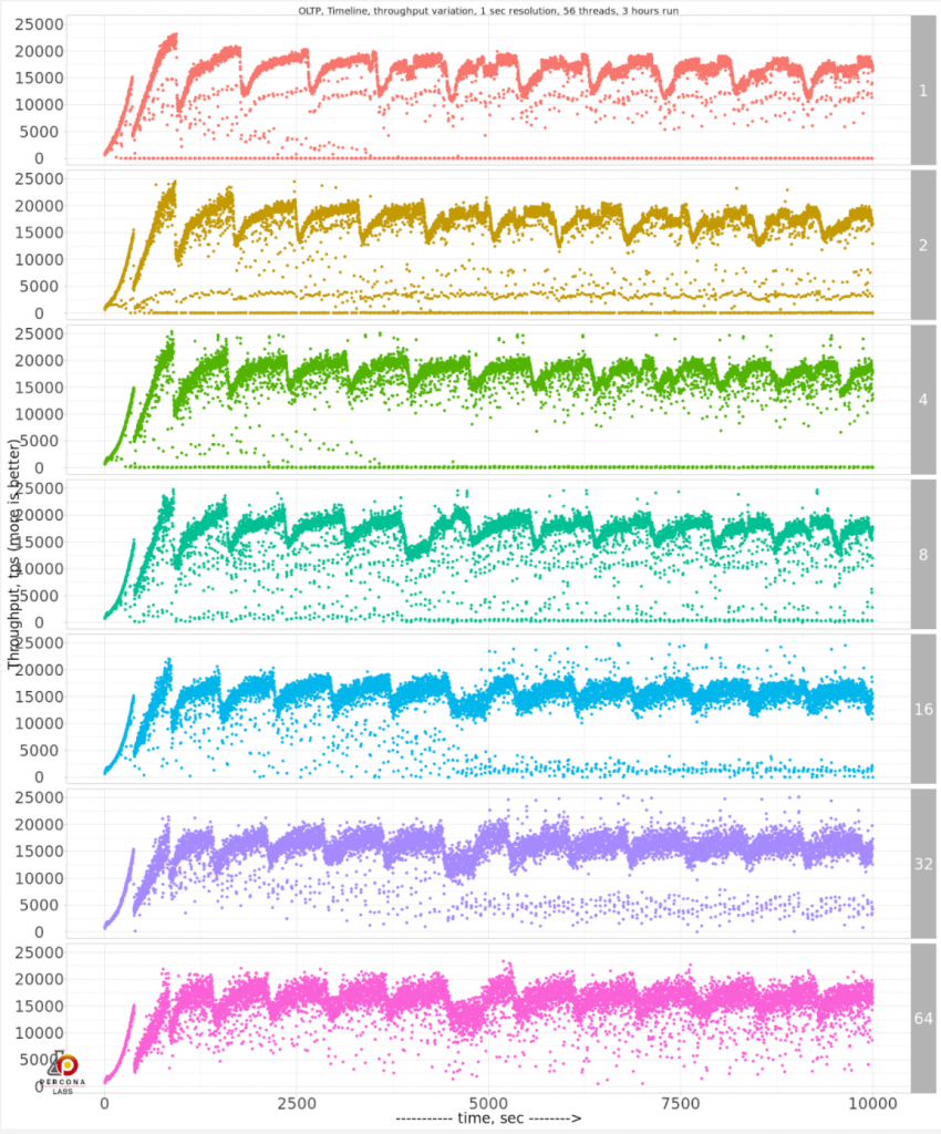 实际上,innodb_buffer_pool_instances = 64 表现出最佳的吞吐量,并且可变性较小,因为即使 innodb_buffer_pool_instances = 32 也会出现明显的停顿。