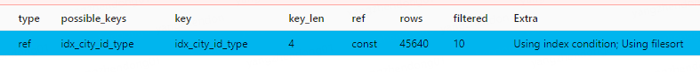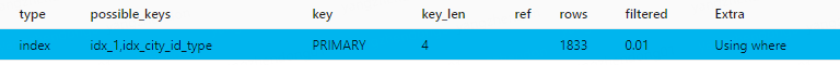 可以看到是有idx_city_id_type和idx_1索引的,我们的查询条件是city_id和type,这两个索引都是能走到的。