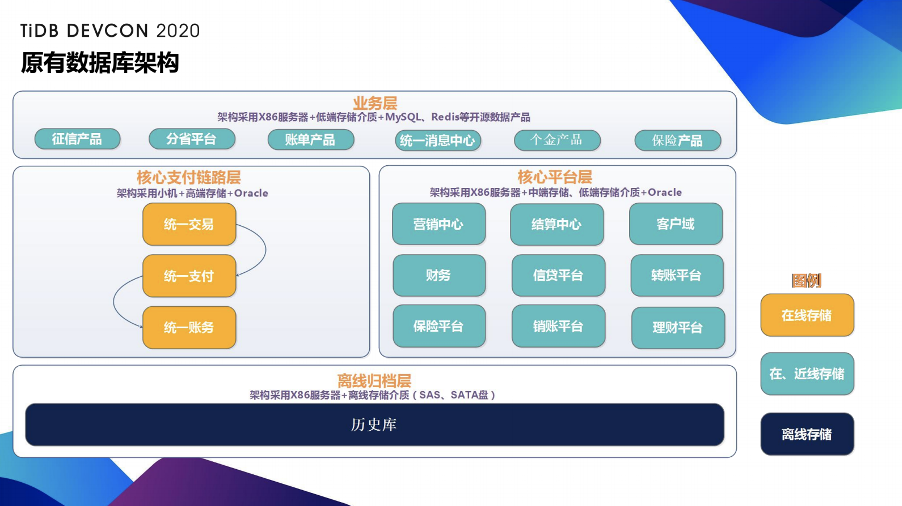 在业务选取和应用上,我们从边缘做起,首先从历史归档库进行产品的基础功能和性能验证;然后从外围切入,比如说选取统一消息、营销业务进行实际业务切入;然后再向重要的业务进行过渡,比如选取征信业务、账单业务、账目、以及结算的对账类的业务进行推进,这些是我们现在已经推进的内容。接下来我们规划的要做的就是向核心进发,在 CIF、支付、交易、账务体系中选取试点业务。