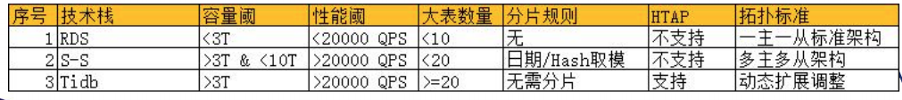 下面这个表里显示的,我们主要就是三类技术站,按照容量阀、性能阀、大表的数量、分区规则、 HTAP,以及拓扑结构这几个纬度进行筛选。