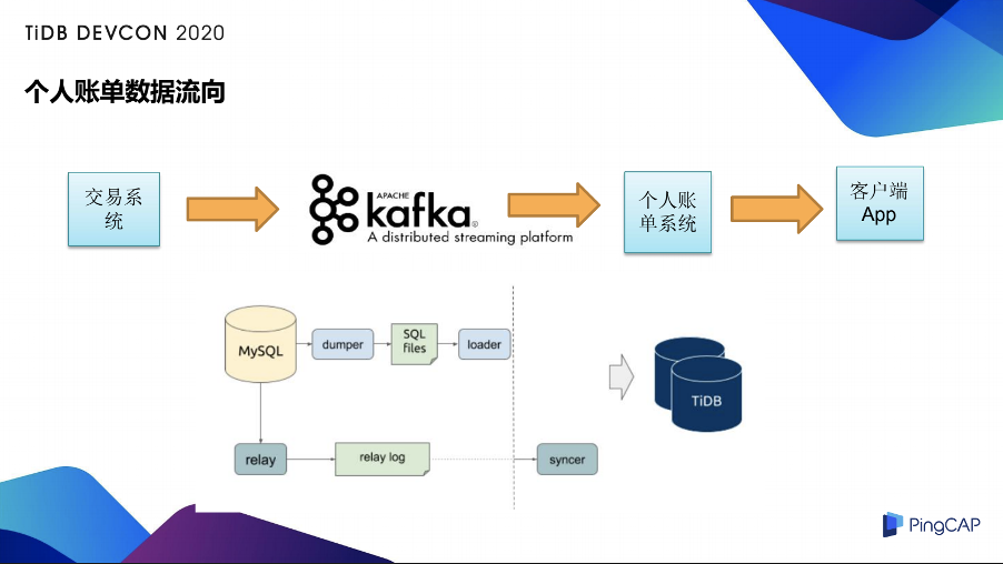 这里是个人账单的数据流向图。首先是交易系统会把交易的信息同步到 kafka 里,然后会消费到个人账单系统里面,经过个人账单系统的处理展示到 APP 端。这里我们选用了 TiDB 的 DM 进行了 MySQL 迁移到 TiDB, DM 工具既可以支持全量备份文件,将 MySQL 的数据导入 TiDB,也支持通过解析执行 MySQL binlog 的方式来增量同步到 TiDB,同时它也满足了我们多个 MyCat 的分库分表,需要合并到同一个 TiDB 一张表的场景。DM 提供了比较好的支持,大家可以看一下 DM 的工作原理图,上面就是数据的全量迁移的功能,下面的数据流就属于一个增量数据同步的过程。