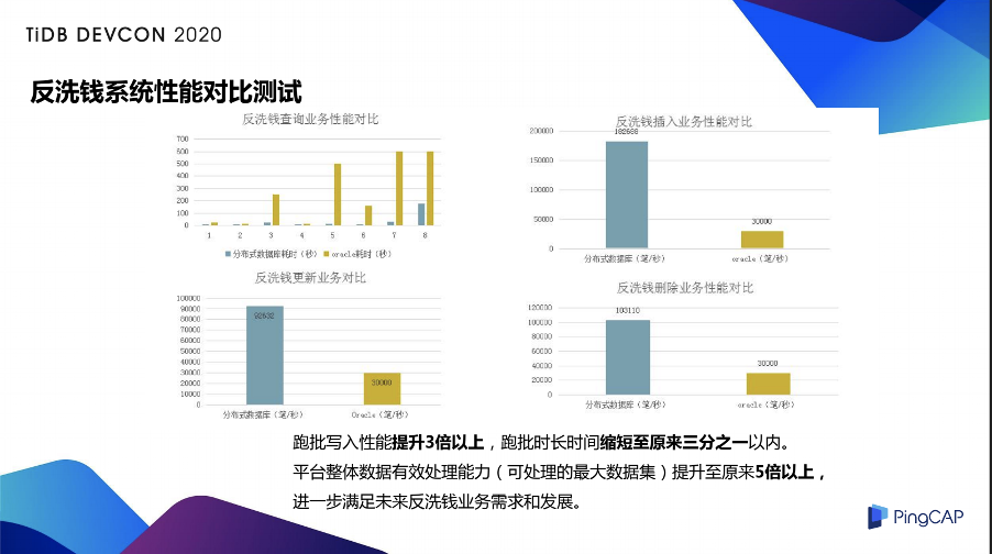 这里我们在反洗钱系统上做了四项性能对比的测试,包括反洗钱查询业务性能对比、反洗钱插入业务性能对比、反洗钱更新业务对比,以及反洗钱的删除性能对比。从测试结果来看,整体跑批性能提高了 3 倍以上,跑批时间也缩短到原来的 ⅓,平台整体有效处理能力提升到 5 倍以上,进一步满足了反洗钱的需求。