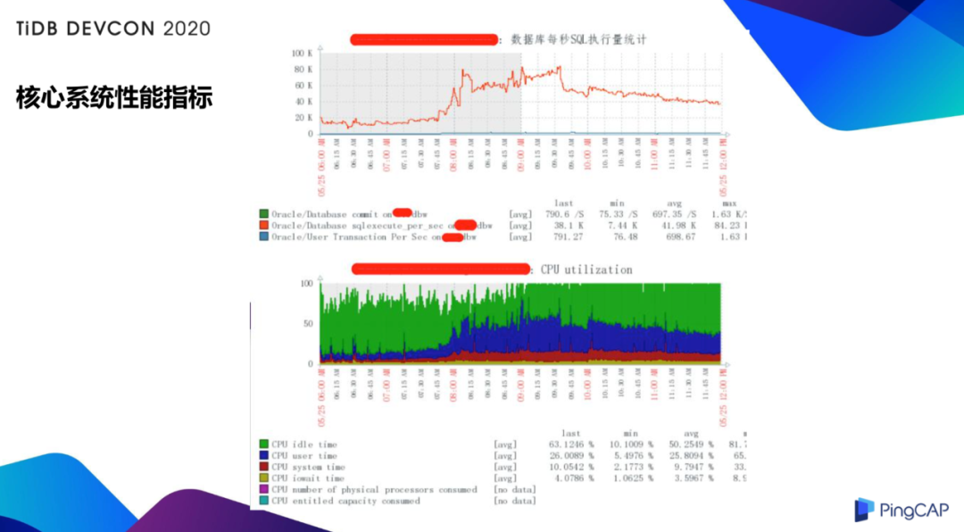 另一方面也是出于性能的考虑。大家可以看这个监控图,是翼支付的一个活动中,核心系统的 QPS 和 CPU。可以看出来,在活动的高峰我们使用的系统是两台高端的小机和高端存储,其中一个单节点的执行量大概在 8 万 4,这时候 CPU 的最小贡献在 10%,说明我们的性能已经基本达到上限了,一旦后面有业务增长,数据规模再增长的时候,性能可能会出现一些瓶颈,小机设备难以扩容,这也是核心链路上考虑分布式数据库的原因。因此我们可以利用 TiDB 的分布式特性进行水平的扩展,使业务得到一个快速的扩容。当前还处于一个调研阶段,由于核心系统对稳定性和性能的要求也是对 TiDB 数据库的挑战,这是我们下一步的目标。