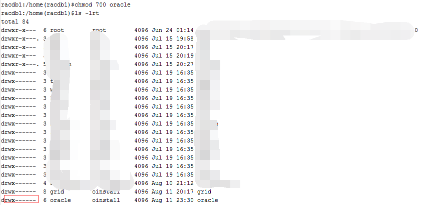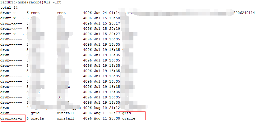 继续查看/home/oracle目录权限为775,而涉及GI安装的grid用户目录/home/grid权限为700