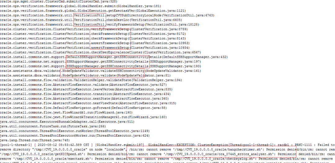 看到这我们可能会有疑问,为啥/tmp目录下文件不能操作竟然会报用户互信未创建?dbca在第四步选择节点之后点击下一步时,在进入检测用户互信这个函数方法中,/tmp/CVU_19.0.0.0.0_oracle(CVU执行框架目录)下的文件创建动作是包含在其中,所以只要其中一部分代码运行异常,就会抛出互信未配置错误。这个我们从dbca日志中的函数调用过程可以看出端倪。