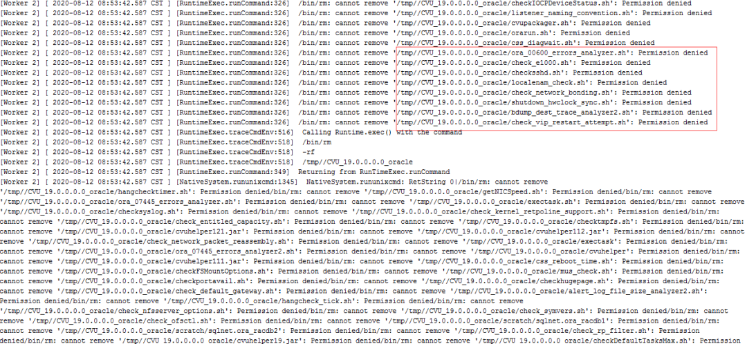 日志显示由于权限问题导致无法remove/tmp/CVU_19.0.0.0.0_oracle下的文件