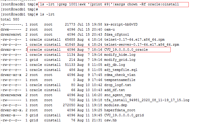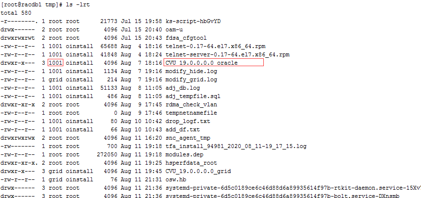 看到这里我们知道了dbca时要先删除/tmp/CVU_19.0.0.0.0_oracle下面的文件,重新生成文件。由于这个目录及其所属用户为1001,故无法删除,导致报错。1001怎么来的呢?沟通了解到这机器上之前装过数据库,通过$GI_HOME/crs/install/rootcrs.sh-deconfig-force卸掉之后,/tmp目录下的残留的文件并没有随脚本运行完成之后自动删除。Oracle用户也干掉重建了,然后新装数据库时,新oracle的uid跟以前的不一样,于是就出现了1001。重新给/tmp下所有1001的目录及文件进行级联属主变更