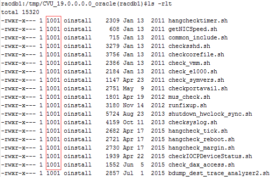 查看/tmp/CVU_19.0.0.0.0_oracle(CVU执行框架目录)及其下面的文件显示用户为1001