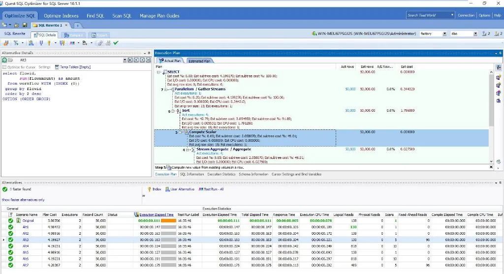 最底下的那个窗格,罗列了所有可以执行的改写过后的SQL,右边的窗格,显示了每个执行计划的成本分析。