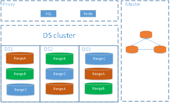 属于计算层,可以水平扩展,兼容标准的SQL与Redis协议,负责接收SQL请求,处理SQL相关的逻辑,并通过Master找到存储计算所需数据的DS地址,与DS交互获取数据,最终返回结果。Proxy是无状态的,其本身并不存储数据,只负责计算,可以无限水平扩展,可以通过负载均衡组件(如LVS、HAProxy或F5)对外提供统一的接入地址。