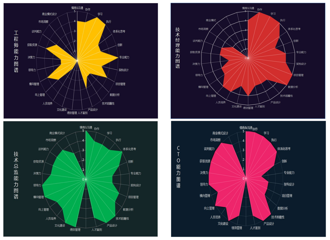 有了方向,有个阶段判断,那如何突破呢?是需要找到晋级台阶的差距。上面几个图是技术人职位的技能图谱,从工程师到技术经理、技术总监直到CTO。不同职位对人员的要求不同,例如对工程师而言,主要考察学习能力(即快速掌握技能的能力)、执行能力(具体做事的能力)、专业能力(具体技能的能力),而对于其他技能来说,相对要求没那么高。如果从工程师升级到技术经理,则需要提升自己在协作、项目管理、数据分析、向上管理、人员管理等方面。可以看出随着进阶,对人员“综合”能力的要求更高。雷达图中的很多能力,都是所谓“软技能”,这些技能是需要有针对性地加以训练提高。