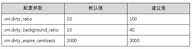 vm.dirty_expire_centisecs = 300vm.dirty_writeback_centisecs = 100vm.dirty_background_ratio = 5vm.dirty_ratio = 80