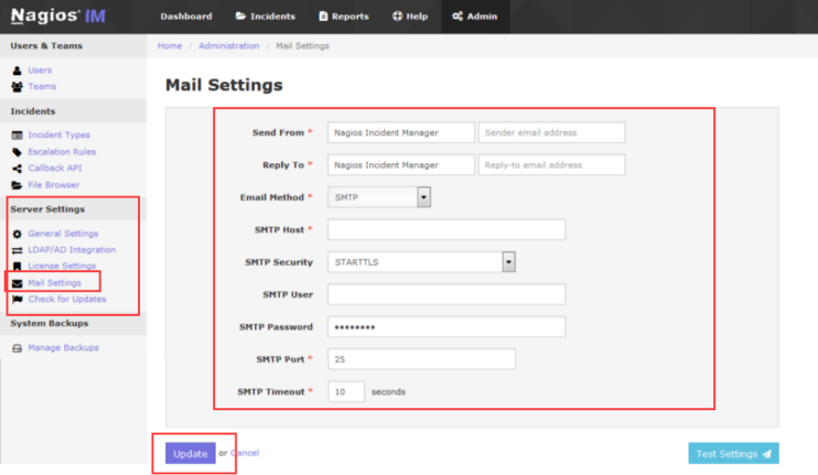 Nagios 事件管理器中主要包的菜单有: 智能仪表盘(Dashboard)、事件(Incidents)、报告(Reports)、管理(Admin)和帮助菜单。