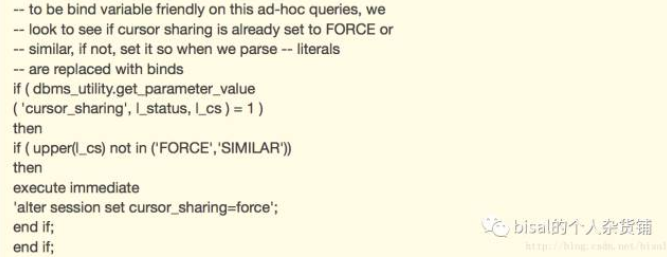 为了让这个存储过程,执行的SQL语句能用上绑定变量,减小硬解析,设置cursor_sharing为FORCE,