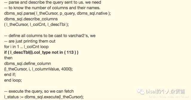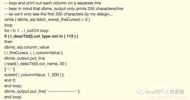 逐字段来打印每一列,因为dbms_output仅打印255个字符/行,因此此处列显示200个字符截取了,同时列名右补空格满足30位,