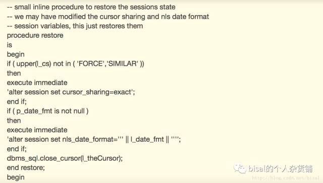 定义了一个内联的存储过程restore,用于脚本执行完成恢复配置,包括cursor_sharing参数、nls_date_format参数,以及关闭游标,