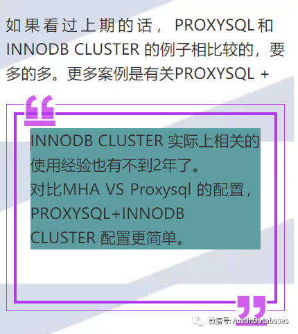 实际上proxysql 本身支持的MYSQL的高可用方式中,早早就支持了MGR的方式了,之前是写过PROXYSQL 支持 MYSQL 5.7 高可用的方式,使用了有也有很长一段时间,很稳定。有同学反映,在搭建MYSQL8.019时,照方抓药发现问题无法解决。下面先将安装的流程来一边,在说到底为什么,老方法不行了。
