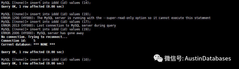 不断继续插入数据,查看是否有失败的情况,结果 在主节点进行切换期间,写操作失败