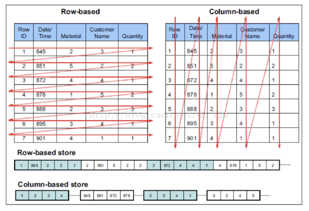 接着我们用图示,来理解一下列式数据库和行式数据库区别,在传统的行式数据库系统中(MySQL、Postgres 和 MS SQL Server),数据按如下顺序存储: