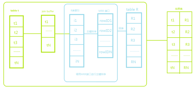 Block Nested-Loop join,基于块的嵌套循环,简称BNL算法,其优化思路主要是减少被驱动表的循坏次数,它会将驱动表的数据缓存起来,把参与查询的列缓存到join buffer里,然后拿join buffer里的数据批量与内层表的数据在join buffer中进行匹配,满足join条件的,作为结果集的一部分返回。 可以看到该算法对两个表都进行了全表扫描,因此扫描的行数是两个表的行数之和。这种场景下,虽然在扫描行数上和NLJ算法一样,但是由于BNL算法是在内存中进行判断,速度上会快很多。 join buffer的大小是由参数join_buffer_size设定,默认256k。如果一次放不下驱动表的所有数据,会分段放,这种情况下会导致被驱动表扫描多次。如果被驱动表是冷数据表,并且多次扫描读取被驱动表间隔超过1S的话,就会将他放入LRU链表的young区域,导致业务数据无法进入热数据区,减少了bufferpool的命中率,这又是另外一个课题了,暂不过多展开。我们可以通过调大join_buffer_size来提高缓存的数据量,减少对被驱动表的扫描次数。启用BNL算法需要在optimizer_switch参数中设置block_nested_loop=on。 BNL算法提升了join的性能,但是它在通过辅助索引连接后需要回表,就会消耗大量的随机I/O,我们知道随机IO对MySQL的影响是非常大的。因此MySQL5.6引入了Batched Key Access(BKA,批量键访问联接)算法。 再说BKA算法时不得不提的就是MySQL的Multi-Range Read 优化,MRR的目的主要是减少磁盘的随机访问。我们都知道,Innodb索引采用的是B+tree的数据结构,数据保存在主键索引中,并且是按照主键递增的顺序插入的,但是二级索引的排列顺序和主键的排列顺序一般是不一样的,它保存的主键值也并非按照主键顺序排列,在回表时就会出现随机访问主键索引的情况。所以如果可以按照主键递增顺序查询的话,对磁盘的读比较接近顺序读,这样就能够提升读性能。 MRR优化的思路就是在进行范围查询时,在得到主键值之后,先按照主键的顺序进行排序,然后拿着排好序的主键ID再去主键索引进行查询,这样就能体现出顺序性的优势了。因为是多值查询,所以一般用于range、ref类型的查询。 再说会BKA算法,当被驱动表上有索引可以利用时,那么就在行提交给被 join 的表之前,先对两个表的对应列的索引字段进行join,得到主键值后,按照主键排好序后,利用 MRR 技术,批量访问表取数据,减少了随机 IO。但是如果被 join 的表没用索引的话,那就只能使用BNL算法了。set optimizer_switch='mrr=on,mrr_cost_based=off,batched_key_access=on';