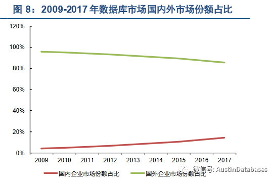 从上图可以看出从2009年开始,国内的数据库市场处于0 ,但到2017年已经达到20%, 当然从今年开始估计这个数字会更好看。