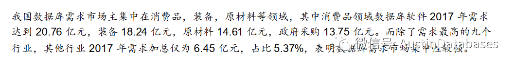 这篇文字在开头就指出,我国2020年的数据库软件市场规模会达到200亿元。当然这结论不是直接得出,是通过多年的调研和数据,分析得出,2009年到2019年,我国的数据库市场以平均17.5的速度平稳的增长。其中的另一个数据2017年我国的120.22亿元的数据库市场,国外的软件企业份额在103.07亿元,16亿元的国产数据库份额在 14.27%。
