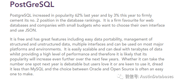 回到正文做技术的同学都希望埋头钻研技术, 其实在行业中生存,也是需要狐獴精神的,觅食的过程中,是不是抬起头看看,有没有猛兽到访,天上的,路上的,四肢行走的,匍匐前进的,还有电闪雷鸣加雨雪冰雹,稍有不慎,没看到就可能成为牺牲品.会偶然 search 一下 Most popular database , the database future ,等词汇.